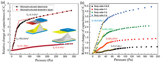 In recent years, various approaches have been investigated to improve the performance of capacitive flexible pressure sensors. A typical capacitive pressure sensor is composed of a dielectric layer sandwiched by two electrode plates. The capacitance of it is mainly determined by the facing area and distance of the two electrode plates, and the permittivity of the dielectric layer in between. The electrode plates and the dielectric layer need to be flexible for a flexible pressure sensor. In order to improve the sensitivity of the flexible sensor to pressure, the dielectric layer should be as soft as possible. Therefore, microstructures in the dielectric layer have been extensively used to lower the Young’s modulus. For example, Kwon and co-workers used a microporous dielectric elastomer molded from a sugar cube as the dielectric layer of a capacitive sensor, and realized highly sensitive and stable pressure sensing with the sensitivity of 0.6 kPa−1 [18]. Bao et al. fabricated polydimethylsiloxane (PDMS) pyramidal microstructures using wet etched silicon mold to develop a highly sensitive capacitive pressure sensor with a sensitivity of 0.55 kPa−1 [6]. Kim et al. fabricated a capacitive pressure sensor with nano-needle structures on the dielectric layer [19]. Zhang et al. used microstructured PDMS molded from natural leaves as the dielectric layer for a flexible pressure sensor and demonstrated a high sensitivity of 19.8 kPa−1 in the pressure range below 0.3 kPa [20].