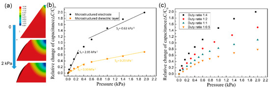 In order to understand the mechanism of the effect of microstructured electrode on sensing performance, FEA simulating the elastically deform process of the PDMS pyramid electrode under external pressure was conducted (Figure 6a). The capacitance change was calculated by extracting the surface nodes information of the deformed pyramid using MATLAB. For comparison, capacitance change of SMD with the same pyramid dimension was also calculated. As shown in Figure 6b, the simulation results show that the relative capacitance change of both SME and SMD have two linear regions as a function of applied pressure and SME has a much higher sensitivity than SMD. In addition, the sensitivity of the device increased with the decrease of pyramid duty ratio (Figure 6c). These results are in agreement with the experiment results qualitatively. However, the sensitivities from the simulation results are much lower than the experimental results, probably because the hypothesis conditions for simulation are not consistent with the real physical situations completely.