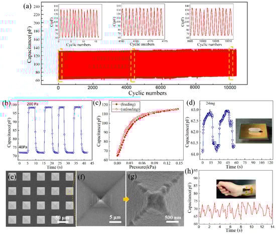Flexible pressure sensors have drawn a tremendous amount of attention due to their wide applications in mobile biomonitoring, wearable electronics, artificial intelligence, energy harvesting and human interface devices [1,2,3,4,5]. The pressure involved with most of these applications is mainly divided into four ranges, i.e., ultra-low pressure (<1 Pa), subtle-pressure regime (1 Pa–1 kPa), low-pressure regime (1 kPa–10 kPa), and medium pressure regime (10 kPa–100 kPa) [4,6]. Flexible pressure sensors in the subtle-pressure regime with high sensitivity are needed for the in situ detection of weak physiological signals such as blood pressure, pulse wave, heart sound, and breath sound. The key parameters that evaluate flexible pressure sensors include sensitivity, response time, detection limit, and reliability. Various successful pressure-sensing mechanisms have been demonstrated, including capacitive [6,7,8], piezoresistive [5,9,10,11], piezoelectric [12,13], optical [14], and triboelectric principles [15]. Capacitive pressure sensors, taking advantage of their simple device construction, long-term drift stability, and low power consumption, have been a better choice for electronic skin and wearable devices [16,17,18].
