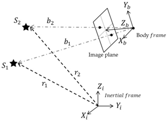 The first class of algorithms was developed to utilize angular distance and singular values because they are invariant under coordinate transformation. The vector measurement of a star tracker is the rotation of the star reference-unit vector from inertial to body frame, as denoted in Figure 1. Let be the star reference-unit vector expressed in the inertial frame, and is the corresponding vector in the body frame.