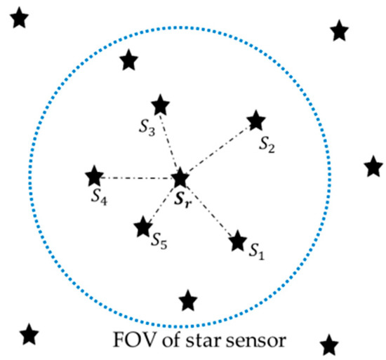 The proposed algorithm generates a pattern with a specific number of imaged stars. It requires six stars for the pattern, one of which is the reference star that we want to identify; the other five stars are used to construct a unique pattern. Prior to generating a pattern, the singular values should be computed using the imaged stars. To avoid further ambiguity, it should be noted that brightness information is completely excluded from this method. Then, the five nearest stars will be selected because, without brightness information, the only way remaining is to make use of the distance in the image plane. The illustration of the 6-star pattern is shown in Figure 2. The reference star is and the nearest five stars can be distinguished by their subscripts: , , , , and in the figure.