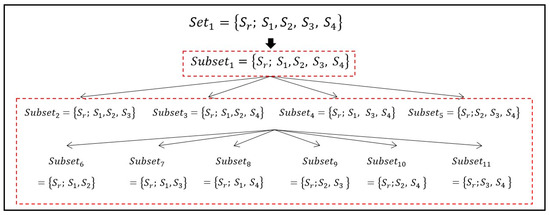 Figure 3 shows an example of constructed subsets for one set of a reference star (denoted as ), where represents indices of the subset (). As one can see in the figure, the subsets are divided into two parts by the boxes. Here, (in the first box) is used for the initial match. Then, database stars that are not similar to singular values from are filtered out in the initial match, so that they are not considered as candidates. The principal advantage of this idea is that there is no indexing issue. As long as the same five stars are used, identical singular values can be obtained regardless of the selection order. We only select five stars and no other information is needed for the initial match. With the help of the initial match, the algorithm has the potential to save time needed for identification and to provide more reliable performance by eliminating candidates from the database. This reduces the number of stars that need to be compared.