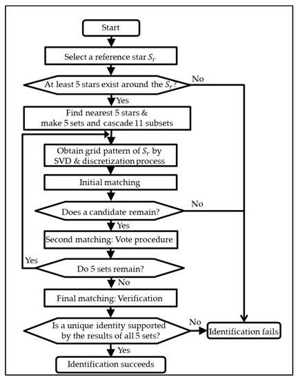 Once the patterns were configured, imaged stars could be identified using a sequence of three matching schemes. Figure 5 shows a flow chart of a single identification process in the proposed algorithm. It starts from the initial matching stage to reduce the candidates in the database. As mentioned earlier, the pattern constructed from the subset of five stars was used for this purpose (see Figure 3). The candidates remaining after the initial match, only then were compared with the reference star. In this second stage, one of the candidates was selected as the reference star of Set 1 by a voting procedure. The voting procedure used 10 patterns from subsets of three and four stars to find the most similar patterns between the imaged and catalogued stars. Both the initial match and voting procedures were repeated for every five sets of the reference star (in Equations (18)–(22)).