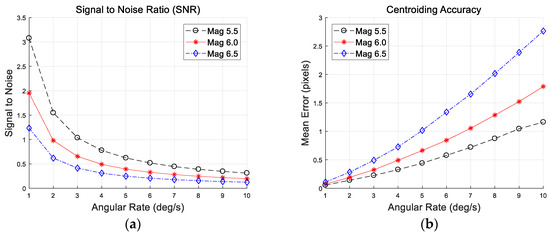 Figure 7 shows results of the simulation tests for stars of varying stellar magnitudes. As you can see in the results, the signal-to-noise ratio gradually decreases with increasing angular rate, and leads to a serious drop in the centroid accuracy. For each stellar magnitude, they go through an identical trend with increasing angular rate, but the loss of intensity is more severe with dim stars than with a bright one. The results for a given stellar magnitude at an angular rate of 10 deg/s are listed in Table 5. The stars of 6.5 stellar magnitude have substantially larger error, meaning that the centroid accuracy is 2.76 pixels. This decreased accuracy is unfavorable for subsequent attitude determination, even if the stars are identified correctly.