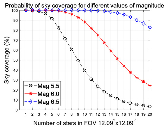 To determine the magnitude threshold able to satisfy the desired availability of sky, the probability of the number of stars in the field of view (FOV) should be considered at the same time. The proposed method requires at least six stars, so the criteria for availability were selected based on this value. The Hipparcos stellar catalog was scanned with 6752 uniformly distributed directions over the entire sky to investigate the availability. Strictly speaking, extending the magnitude threshold to dim stars increases availability. Figure 8 shows sky coverage plots and Table 6 summarizes the results at each stellar magnitude. The 5.5 stellar magnitude has a lack of sky coverage that amounts to a probability of only 82.24%. Thus, we concluded from these results that the threshold for stellar magnitude should be 6.0, considering both availability and centroid accuracy. As a result, the proposed algorithm can tolerate centroid error of about 1.79 pixels, which is the worst-case error at a slew rate of 10 deg/s.