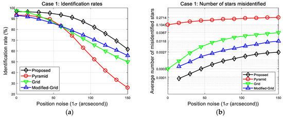 To analyze the performance of the algorithm, simulations were carried out for three different cases. The first case was to measure the fundamental performance of each algorithm as it performed star identification for a single reference star. In this case, the identification rates and average number of misidentified stars were provided to allow comparison of the proposed algorithm with others. The positional error was introduced as a single noise source via random Gaussian noise with ranging from 0 to 150 arc-seconds. The simulation was performed 10,000 times at each noise level. Figure 10 shows plots of the identification rates and number of misidentified stars.