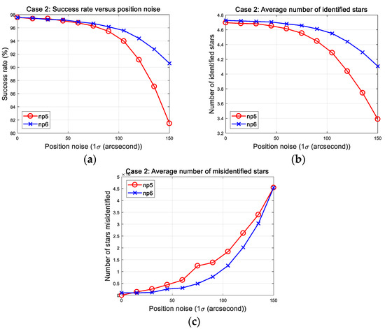 The proposed algorithm creates a database that includes the six nearest stars. This is one of several redundant strategies to enhance the capability of the algorithm because the pattern of the reference star is generated using the five nearest stars. However, the image pattern was also modified to be generated using the six nearest stars as with the database strategy. Then, the five sets of computed patterns (Figure 9) were expanded to produce 15 sets of an extended pattern. This modification is examined in the Case 2 simulations. The results are shown in Figure 12, in which np5 and np6 mean the case using the nearest five and six stars, respectively.