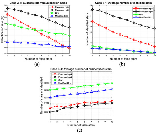 First presented are the results of the narrow FOV case (Case 3-1 in Figure 13). The success rates of all algorithms tend to decrease with increase in the number of false stars. These results are incurred by the probability that the spurious stars are likely to generate patterns entirely different from the stored one. In dynamic situations, this error factor is inevitable, but the proposed method can handle such cases due to its pattern complexity and matching strategy.