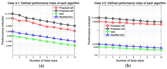 Performance index of each algorithm at 150 arc-seconds position error: (a) Case 3-1 indicates performance with narrow FOV; (b) Case 3-2 indicates performance with wide FOV.