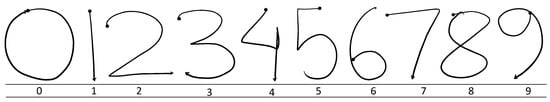 A simple interactive UI was designed requiring minimal instructions. 10 participants (8 males and 2 females) aged 23 to 30 years were recruited; all were graduate students. The writing order is shown in Figure 2, which is similar to the traditional writing order. We did not apply graffiti or uni-stroke writing constraints [31]. The stroke orders for each letter were defined in the usual manner, i.e., the box-writing process [13]. There are two types of approaches to recognize the air-writing system, online and offline. Herein, we followed an offline method which is also known as the ‘push-to-write’ approach to collect the data [11,13,28,32]. In this process, users were requested to write digits in front of the depth camera, and that was collected as a spatial trajectory sequence.