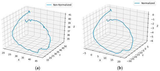 Three-dimensional trajectory visualization: (a) sample trajectory before normalization and (b) trajectory after normalization.