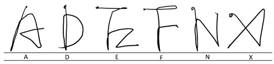 6DMG is a motion gesture dataset containing gestures and alphanumeric air-writing data [33]. The dataset was collected through the Wiimote device, performed by 28 participants. Wiimote is a handheld device that works based on acceleration and angular speed. The orientation of this device was computed using the inertial measurement. In this study, we employed this 6DMG air-writing dataset. Some sample characters are shown in Figure 4. All characters are written in a uni-stroke manner.