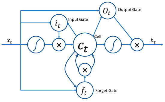 LSTM [34] is a variant of a recurrent neural network (RNN). Unlike the standard feed-forward network, LSTM has feedback connections that make it significant. The architecture of an LSTM cell is shown in Figure 5.