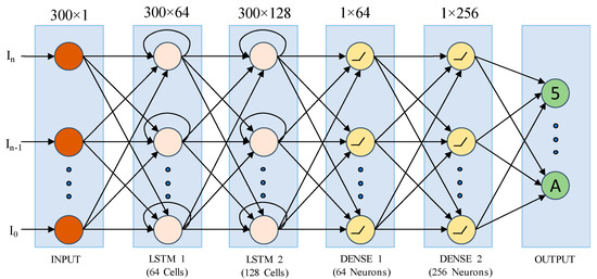 The LSTM layer is composed of a cell containing an input Equation (10), forget Equation (11), and output Equation (12) gates. It is also known as a cell state Equation (13). This state is modified by the forget gate. It helps to decide what to be removed from the previous state, and thus, the cell keeps only the expected information. The output gate in a cell passes the information to the next state.