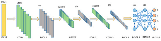 The proposed CNN network is shown in Figure 7. Like the LSTM network, the input layer is also set to the maximum length of the trajectories. The input layer is a 300 × 1-dimensional vector that transfers the input value to the 1st separable convolution layer. Convolution layers 1, 2, and 3 contain 64, 128, and 256 channels, respectively. In all the cases the filter size is 3. Each convolution layer is associated with the 1D max-pooling layer. There are two dense layers containing 256 and 128 neurons, respectively. Dropout rate 0.5 is used in the DENSE1 and DENSE2 layers. The ReLU Equation (14) activation function is used for all the cases except the output layer. The softmax Equation (15) regularization is used in the output layer. Adam is used as an optimizer with a learning rate of 0.0001 and categorical cross-entropy as a loss function.