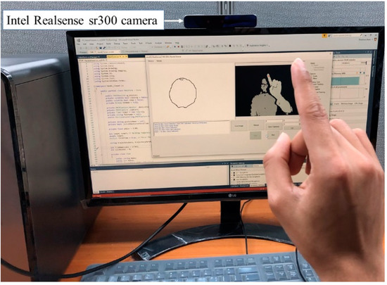 Fingertip detection was performed by an Intel RealSense SR300 camera. It is a widely used TOF camera for gesture detection, finger joint tracking, and depth-sensing research area. Firstly, hand segmentation and detection were done. Normally, there are 22 finger joints in our hands. Amongst them, the index fingertip was tracked for trajectory writing for user convenience. However, the trajectory was drawn through a virtual window. To fit and display in the physical window (such as a computer screen), scaling was required. We calculated the physical distance by multiplying the window size and the adaptive value for both x (horizontal) and y (vertical) directions. The adaptive value is the normalized value between 0 and 1 collected through the RealSense camera. In the User Interface (UI), the window sizes were 640 and 480 for x and y, respectively. The original pixel value was calculated by multiplying the window size and adaptive value.