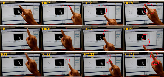 The trajectory was captured in real-time (50 fps). We used the NVIDIA GeForce GTX 1050 Ti graphics processing (GPU) unit with 32 GB memory to speed up the training process. The experimental environment is shown in Figure 8. The digit 0 was written in the air and tracked by the RealSense camera. It is not normalized; hence, the trajectory is a little bit distorted. Some of the complex digits and corresponding sample frames are shown in Figure 9. The frame by frame representation helps to understand the motion for the digit writing order. The trajectory capturing process started from the first frame (F#1). However, the ending frame is different for each individual character due to the different motion and writing patterns.