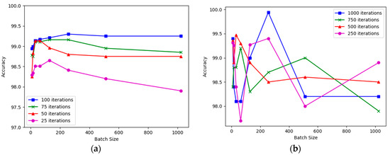 The LSTM model ran for 25, 50, 75, and 100 times. It is shown in Figure 10a that the accuracy is different for each iteration and batch size. As depicted in the figure, the highest accuracy was found in 256 batch size for 100 iterations. Therefore, for LSTM, the considerable batch size and iterations are 256 and 100, respectively.