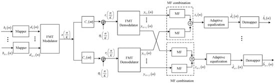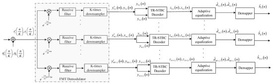The base-band equivalent receive structure of the proposed method is shown in Figure 2, where the received signal in each time frame is subsequently processed by FMT demodulation, TR-STBC decoding, adaptive equalization, and demapping before acquiring the estimation of each information sequence.
