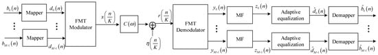 Activities in underwater environments such as environmental monitoring, equipment location and assisted navigation have promoted the development of underwater acoustic (UWA) sensor networks, where high-rate communications with high reliability are required for massive data transmission between sensor nodes [,,]. The UWA channel is a typical frequency-selective fading channel [,], and therefore when single-carrier (SC) modulation is used, a highly complex intersymbol interference (ISI) suppression technique must be adopted at the receiver to deal with massive ISI caused by severe multipath propagation [,,,]. To reduce the complexity of ISI suppression, multicarrier (MC) modulation has been used in UWA communications [,,,,,,,,,,,]. Orthogonal frequency division multiplexing (OFDM) as a MC technique is the most widely used in UWA communications [,,,]. In OFDM, the effect of multipath is restricted within one symbol interval by dividing the communication band into many sub-bands with bandwidth narrower than coherent bandwidth, and therefore the ISI can be avoided. However, OFDM is sensitive to frequency offset due to the strongly overlapping sub-bands with narrow bandwidth, and therefore the complex intercarrier interference (ICI) suppression technique must be exploited in OFDM-UWA communications. Filtered multitone (FMT) modulation is a multicarrier technique that splits the communication band into several separated wide sub-bands without guard bands [,,,,]. Compared with SC, FMT can obviously reduce the complexity of ISI suppression by band splitting. Compared with OFDM, FMT is not sensitive to frequency offset due to non-overlapping sub-bands with much wider bandwidth. Therefore, as the compromise between MC and OFDM, FMT has been applied to UWA communications in the last 10 years.