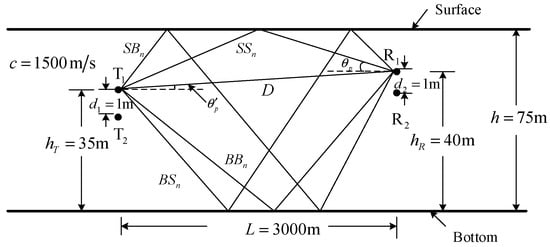 The channel model for simulation is constructed based on the shallow water multipath geometry with a certain number of propagation paths taken into account [,]. The simulation setup is shown in Figure 5.