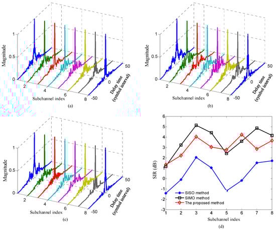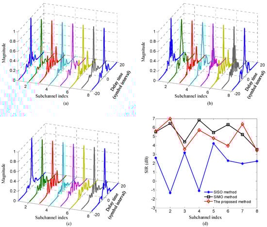 Comparison of the time domain responses and signal-to-interference ratios (SIRs) of composite sub-channels among three methods: (a) sub-channel responses of the proposed method; (b) sub-channel responses of SISO method; (c) sub-channel responses of SIMO method; (d) SIRs of three methods.