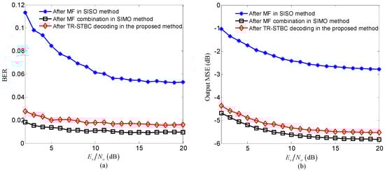 Comparison of the performance after three processing scenarios consisting of time-reversal space-time block coding (TR-STBC) decoding in the proposed method, matched filtering (MF) in the SISO method and MF combination in the SIMO method: (a) bit error rate (BER); (b) output mean square error (MSE).