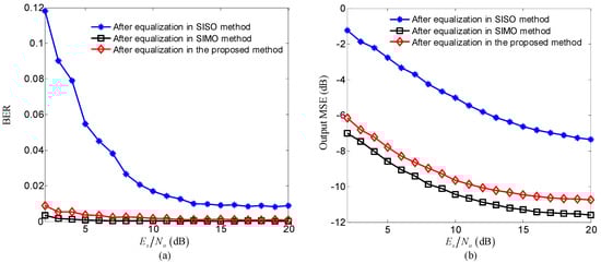 Comparison of the performance after equalization among three methods including of the proposed method, SISO method and SIMO method: (a) BER; (b) output MSE.