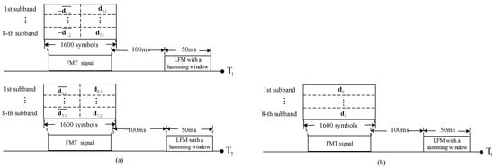 The transmit signal structure of the proposed method is shown in Figure 9 and that of the SISO method and the SIMO method is also displayed. Referring to Figure 9, the signal transmitted by each transducer is composed by a 50 ms, linear frequency modulation (LFM) with a hamming window, a 100 ms guard time interval and a FMT signal. The FMT signals of the proposed method can be obtained by modulating the TR-STBC encoded symbols, the FMT signals of the SISO method and the SIMO method can be obtained by modulating the mapped symbols directly. In experiment, the parameters are the same as which in Table 1 except that the number of equalization coefficients on each sub-band is 25.