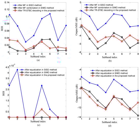 Comparison of the performance for each sub-band among three methods: (a) and (b) comparing the BER and output MSE after three processing scenarios consisting of TR-STBC decoding in the proposed method, MF in the SISO method and MF combination in the SIMO method; (c) and (d) comparing the BER and MMSE after adaptive equalization among the three methods.