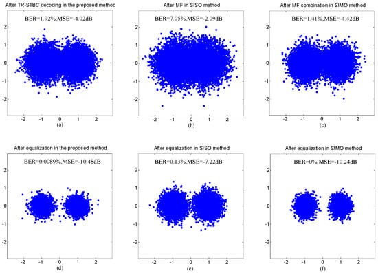 In Figure 11, for each sub-band, the performance after TR-STBC decoding in the proposed method was compared with that after two processing scenarios consisting of MF in the SISO method and MF combination in the SIMO method, and the performance after equalization was also compared among three methods. The comparison of total performance among three methods is shown in Figure 12, where the BER and output MSE of each method are the average over all sub-bands and the dots in scatterplots correspond to all information symbols transmitted on all sub-bands.