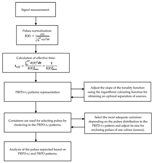 The proposed method relies in the fact that pulses from different sources occupy specific zones in the PRPD-teff pattern. The method is summarized in Figure 1 and implemented in the following steps: