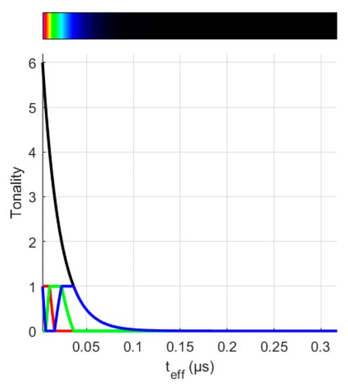 However, taking into account that the PD duration is in the range of tens of nanoseconds to few microseconds [26], the variations of the feature parameter teff among different PD sources is small. For this reason, in order to improve the visualization and ease the classification procedure, a function, which assigns a scale of colours to the pulses’ representation considering their effective time magnitude in a specific range, was implemented. The tones of the colours in the PRPD-teff patterns is defined by a logarithmic function controlled by six states with different combinations for defining the RGB colour specification triplets in Matlab. Figure 4 shows a detail of the logarithmic definition of the tonality and the RGB triplets combination. The slider Slope modifies the curve that controls the transition between the six states, producing the differences in tones among the different PD sources. Figure 3B, shows the PRPD pattern for the selection made in Figure 3C.