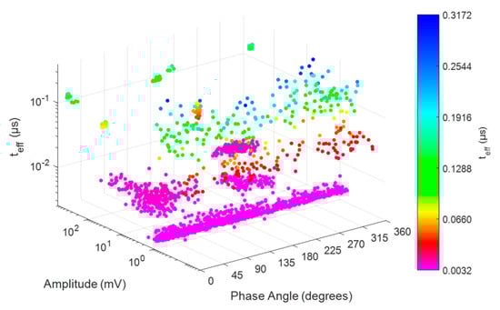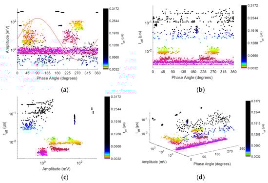 When the third axis is added, Figure 10b, there is a separation of pulses in clusters related to the sources present in the setup. However, as the differences in the effective time corresponding to different sources are small, the classification process is still difficult. The PRPD-time tool allows overcoming this difficulty due to the logarithmic colouring described in Section 2.3. Figure 11 shows the corresponding PRPD-teff pattern for all pulses considered.