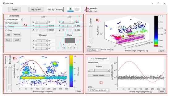 Graphical interface for pulses separation using the PRPD-teff patterns. (A), Container definition: geometry, origin location and size; (B) container geometry plotted in the PRPD-teff pattern; (C), pulse density pattern plot, distance and thickness controls and (D), PRPD pattern for pulses in container that allows the classification by clustering (PDCTC).
