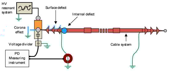 An experimental setup was assembled with various PD defects characteristic of insulated cables. In the test performed an HFCT sensor and a commercial PD measuring instrument [27] were used.