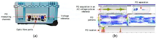 The measuring instrument used was designed by the researching group of LAT-UPM to perform on-line PD measurements [27]. This instrument is equipped with a data acquisition system with the following specifications: 14 bits of vertical resolution, 50 MHz bandwidth and sampling frequency of 100 MS/s. Figure 8 exhibits a frontal view of the measuring device and the main interface window.