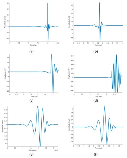 Representative pulses of each signal source measured: corona (a); internal PD (b); surface PD (c); IGBT pulses (d); random noise (e); and electronic noise (f).