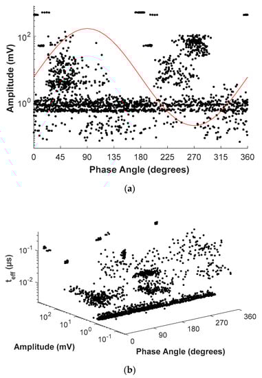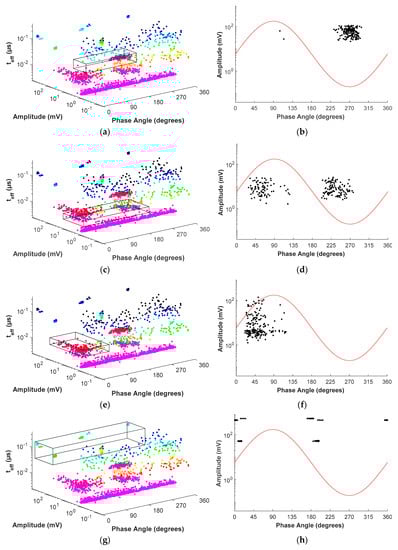 In Figure 12b, it can be seen that the PRPD pattern obtained with pulses separated using the container from Figure 12a exhibits a swarm structure around the maximum amplitude of the negative half cycle with magnitudes dispersed between tens of mV and few hundreds of mV.
