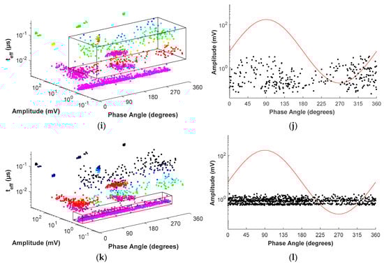 Figure 12j shows the PRPD pattern for pulses inside the container shown in Figure 12i. This PRPD pattern exhibits a non-correlated cloud of points with the voltage reference and a dispersed low magnitude ranging from zero to few mV. On the other hand, pulses are dispersed in a wide range in the effective time dimension, 18–326 ns.