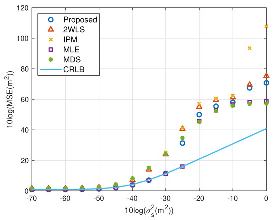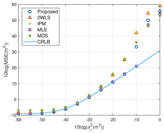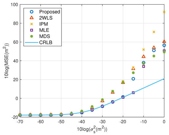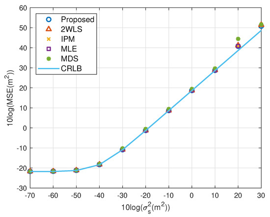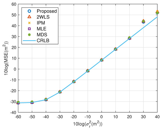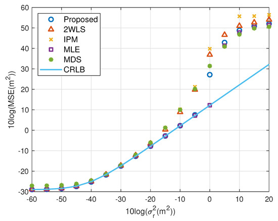 - Chen, S.; Ho, K.C. Achieving asymptotic efficient performance for squared range and squared range difference localizations. IEEE Trans. Signal Process. 2013, 61, 2836–2849. [Google Scholar] [CrossRef]