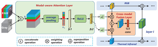 30], our modal-aware attention network is dedicated to exploring efficient feature extraction from a cross-modality level. Based on the basic components of the attention module such as the pooling layer, fully connected layer and activation layer, we build a collaborative structure between modalities at different feature layers to achieve informative feature capture with a scene-adaptive manner. As shown in