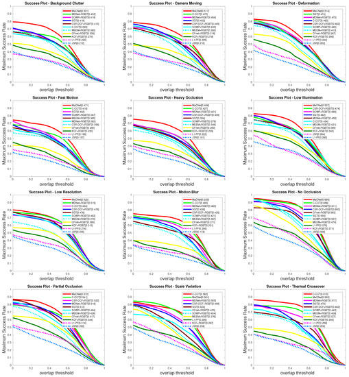 Table 6 include no occlusion (NO), partial occlusion (PO), heavy occlusion (HO), low illumination (LI), low resolution (LR), thermal crossover (TC), deformation (DEF), fast motion. (FM), scale variation (SV), motion blur (MB), camera moving (CM), and background clutter (BC). From