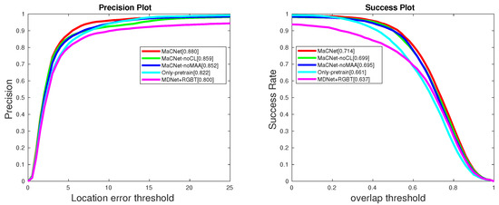 Figure 7, we can draw the following conclusions. (1) MaCNet is significantly better than MaCNet-noMAA, which indicates that the modal-aware attention network can better consider the importance of the information provided by each modality in feature extraction. (2) MaCNet outperforms MaCNet-noCL, which is a good illustration of the importance of considering heterogeneity and complementarity between modalities in multimodal tasks. Competitive learning can better integrate the complementary information provided by the two modalities to improve tracking performance. (3) The result of Only-pretrain is better than MDNet [