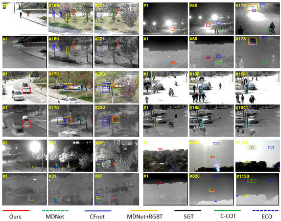 Figure 8 shows a qualitative comparison of our algorithm with three state-of-the-art RGB trackers and three state-of-the-art RGB-T trackers on partial video sequences, including MDNet [