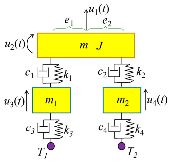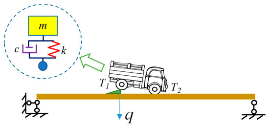 A 4-DOF vehicle model is used to verify the effectiveness of the proposed method, as shown in Figure 18. Since the vehicle model has two wheels, both wheels generate excitation for the bridge, which is a multi-point excitation. Thus, simulation of two vehicle bumps are required to construct the responses of the virtual structure with the additional virtual mass, which can be calculated by Equation (10). Two wheels are adopted for the bump separately with the other wheel stopping on the bridge, and two virtual masses are added at the position of the two wheels in each test.