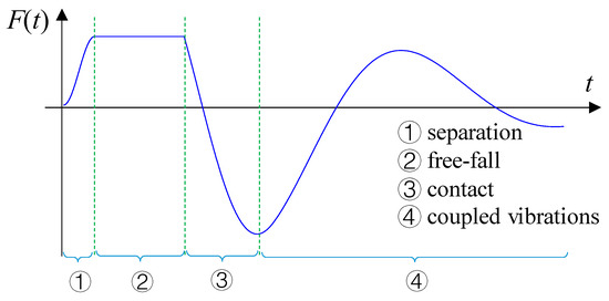 In this stage, as shown in Figure 6, the vehicle and bridge simultaneously vibrate with their initial states obtained from the last period. Denote by v0 the initial velocity of the vehicle at the contact moment, and let xb be the initial state of the bridge. Traditionally, the vehicle tire force applied to the bridge at the initial contact is equal to cv0, where c is the vehicle damping, and the impact is large. Since the vehicle tire is constructed of rubber, the interface force is assumed to gradually increase. The damping of vehicle tire c3(t) is assumed to change with time as in Equation (16), where t3 is the moment of the largest deformation of the vehicle spring: