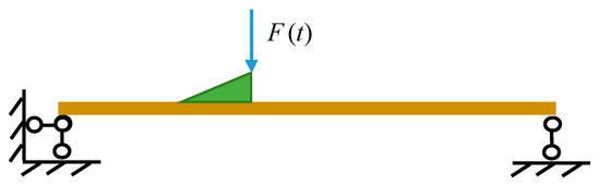 Before the bump test, the vehicle stops on a triangle board, and its weight Fmg = mg causes a deformation of the bridge. The system state at this moment is defined as the equilibrium state. Due to the elastic deformation of the vehicle tire and its non-planar surface, the separation of the vehicle from the board requires the time t1, although it is very short. The pressure of the vehicle to the bridge gradually decreases from Fmg to zero during the time period [0, t1], and the corresponding structural vibration can be found by integrating Equation (13):