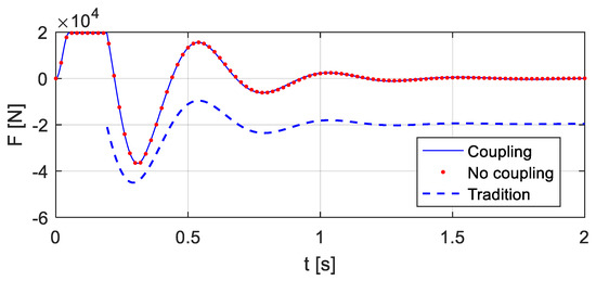 By the analysis in Section 3, considering the vehicle-bridge coupled system, the relative displacement xc(t) and velocity vc(t) between the vehicle and the bridge, as well as the entire time history of the vehicle bump-induced excitation F(t), can be computed, see Figure 9 and Figure 10. The corresponding excitation F(t) of the bridge is shown in Figure 11 ‘Coupling’.