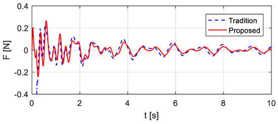 In existing studies of bump excitations, a vehicle falls to the bridge with full contact, which means that the impact forces are instantaneously applied to the structure. In this way, the computed vehicle excitations are shown in Figure 11 ‘Tradition’, which are different from the excitations computed using the proposed method. The structural accelerations that are computed considering the instantaneous impact (Figure 13 ‘Tradition’) are compared with the accelerations that are computed using the proposed method (Figure 13 ‘proposed’), which shows that the differences primarily exist at the beginning of the structural responses. The structural free responses are concerned for the system modal identification in bridge monitoring, and thus the existing studies work well. However, the construction of the virtual additional mass in this paper requires the entire time history of the structural responses and demands a precise estimation of the responses.